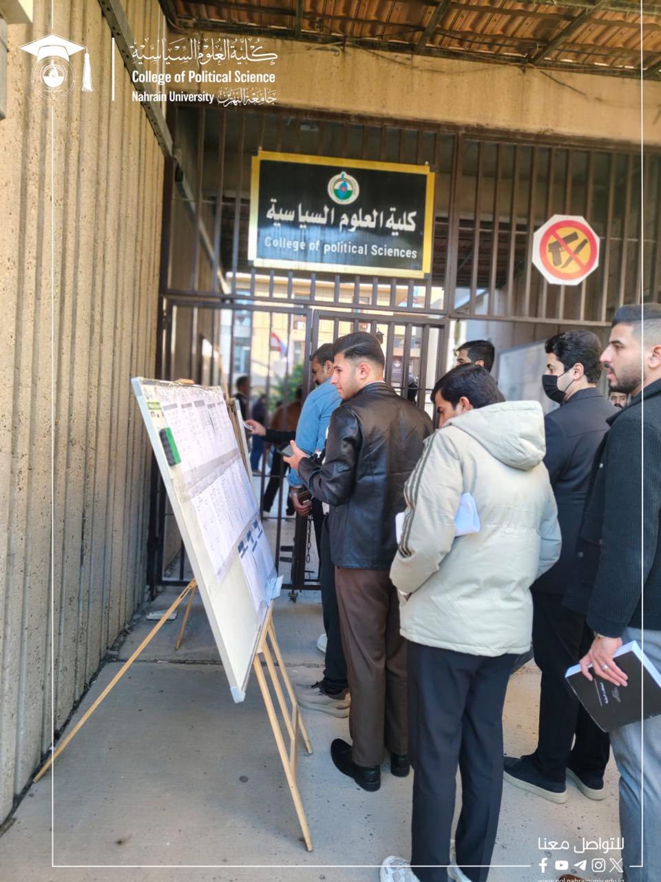 مع انطلاق امتحانات الفصل الدراسي الاول للدراسات الاولية في كلية العلوم السياسية بجامعة النهرين، تفقد معاون العميد للشؤون الادارية الاستاذ الدكتور عباس سعدون رفعت سير الامتحانات، والاجراءات التنظيمية واللوجستية في قاعات الامتحان.