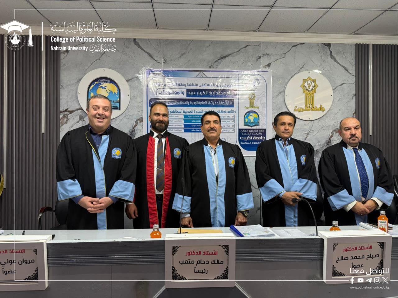 ترأس الاستاذ الدكتور مالك دحام متعب، التدريسي في كلية العلوم السياسية بجامعة النهرين، لجنة مناقشة رسالة الماجستر للطالب حسام محمد عبد الكريم عبيد، التي جرت في كلية العلوم السياسية بجامعة تكريت والموسومة ( استراتيجية الممرات الاقتصادية الجديدة والمنطقة العربية: الفرص والتحديات).