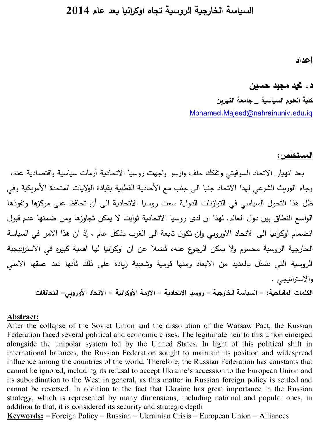 ومما جاء في مقدمة البحث: بعد انهيار الاتحاد السوفيتي وتفكك حلف وارسو واجهت روسيا الاتحادية أزمات سياسية وأقتصادية عدة، وجاء الوريث الشرعي لهذا الاتحاد جنبا الى جنب مع الأحادية القطبية بقيادة الولايات المتحدة الأمريكية وفي ظل هذا التحول السياسي في التوازنات الدولية سعت روسيا الاتحادية الى ان تحافظ على مركزها ونفوذها الواسع النطاق بين دول العالم، لهذا فأن لدى السياسة الخارجية الروسية ثوابت لايمكن تجاوزها ومن ضمنها عدم قبول انضمام اوكرانيا الى الاتحاد الاوروبي وان تكون تابعة للغرب بشكل عام، إذ أن هذا الأمر محسوم ولايمكن الرجوع عنه، فضلا عن أن أوكرانيا لها أهمية كبيرة في الأستراتيجية الروسية التي تتمثل بالعديد من الأبعاد ومنها قومية وشعبية زيادة على ذلك فأنها تعد عمقها الأمني والأستراتيجي.