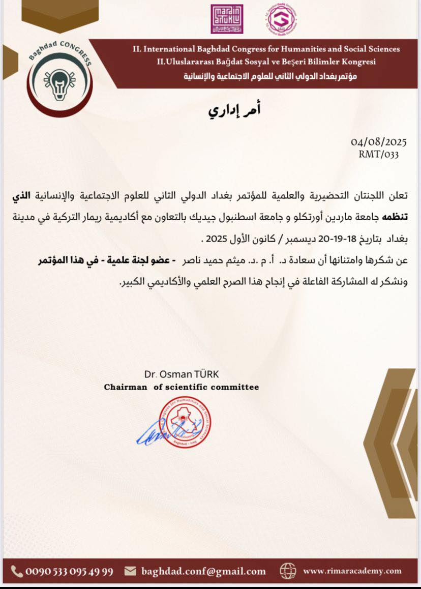 اختارت اللجنة التحضيرية والعلمية لمؤتمر بغداد الدولي الثاني للعلوم الاجتماعية والانسانية الاستاذ المساعد الدكتور ميثم حميد ناصر، التدريسي في كلية العلوم السياسية بجامعة النهرين، عضوا في اللجنة العلمية للمؤتمر الذي من المؤمل ان يعقد في بغداد