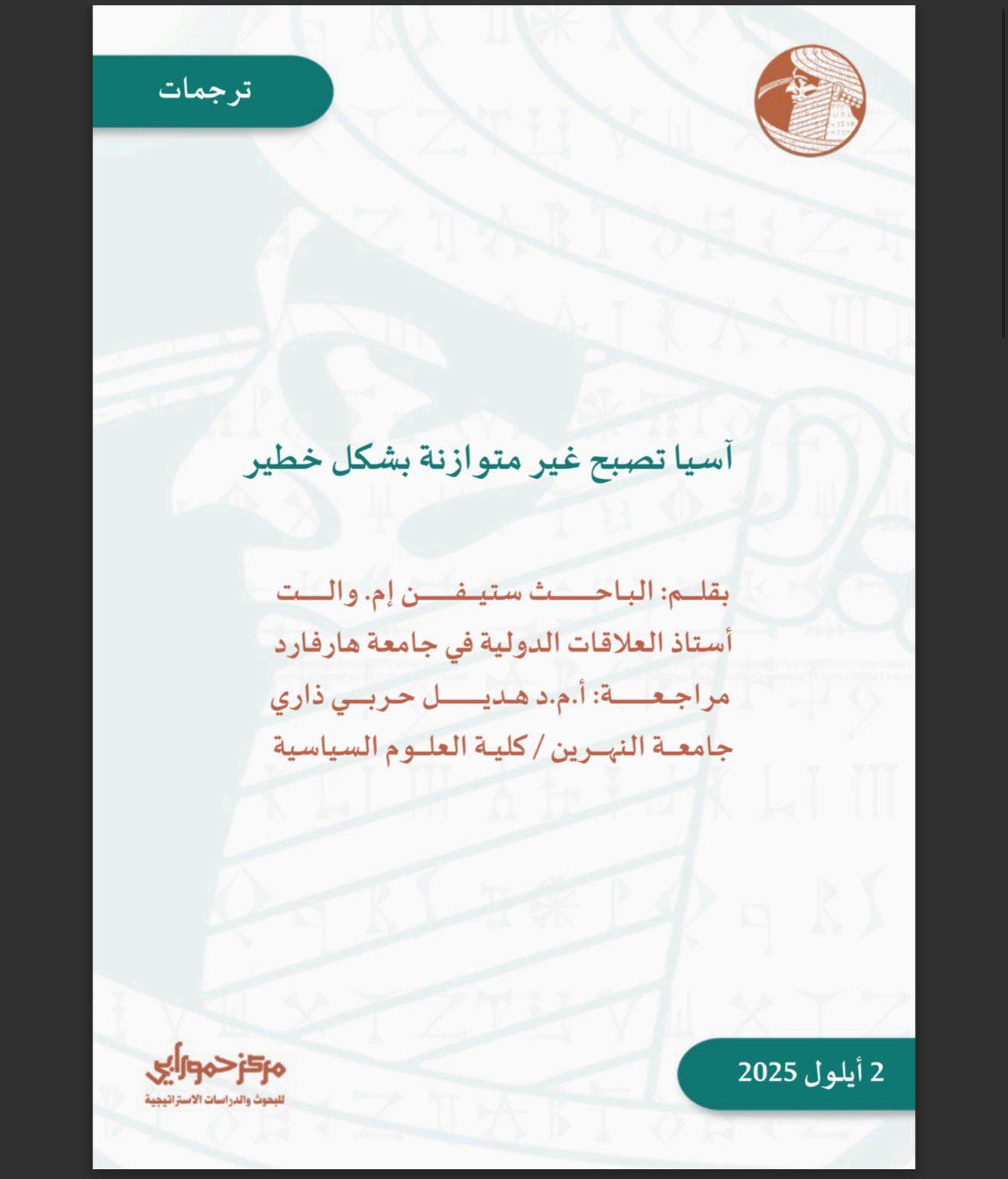نشرت مجلة حمورابي للبحوث والدراسات مراجعة مقال للاستاذ المساعد الدكتورة هديل حربي ذاري بعنوان ( اسيا تصبح غير متوازنة بشكل خطير ) للباحث ستيفن ام. والت استاذ العلاقات الدولية في جامعة هارفارد.