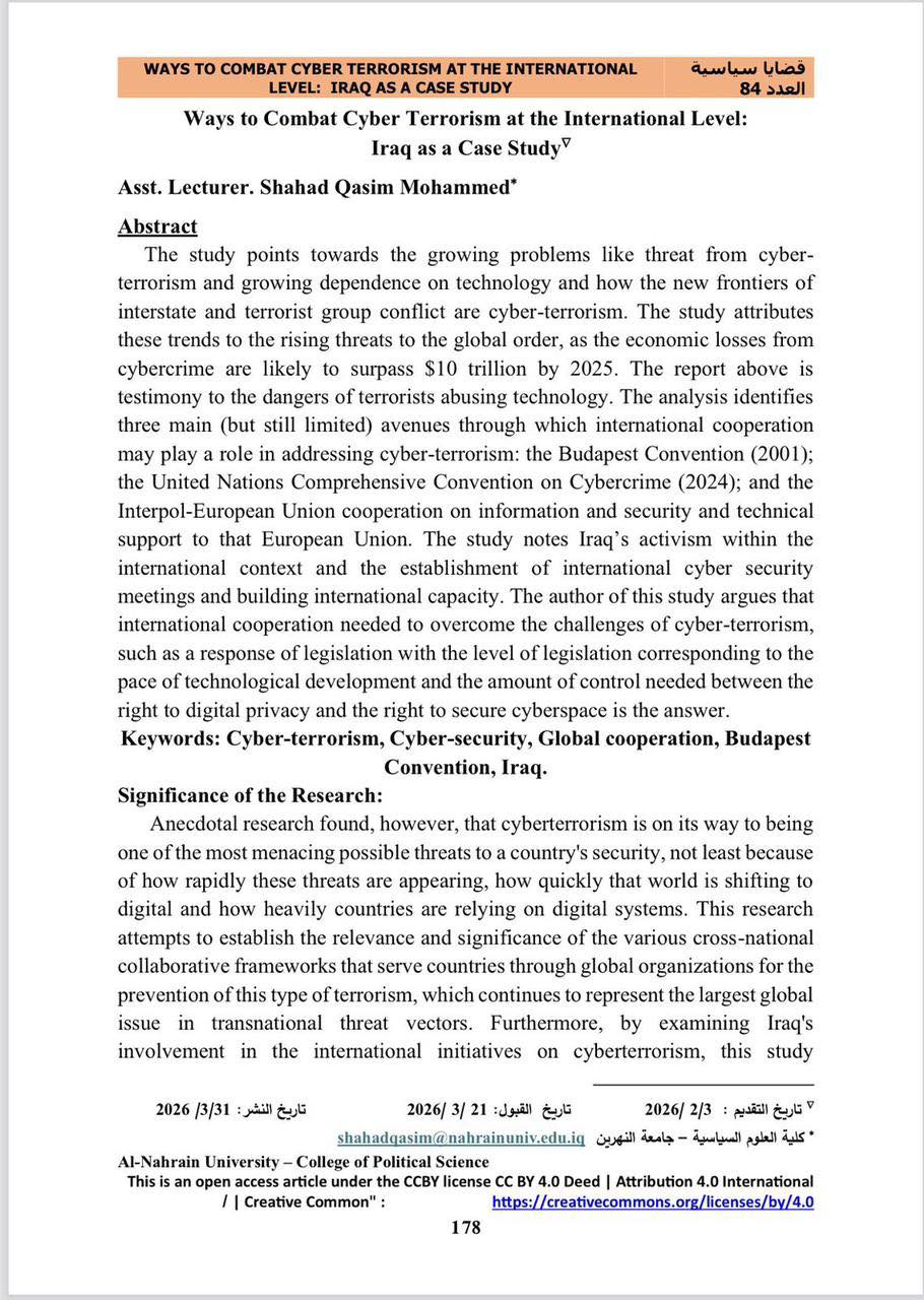 نشرت المدرس المساعد شهد قاسم محمد، التدريسية في كلية العلوم السياسية بجامعة النهرين، بحثا بعنوان (سبل مكافحة الإرهاب الإلكتروني على المستوى الدولي: العراق أنموذجاً) وذلك في مجلة قضايا سياسية، الصادرة عن الكلية.