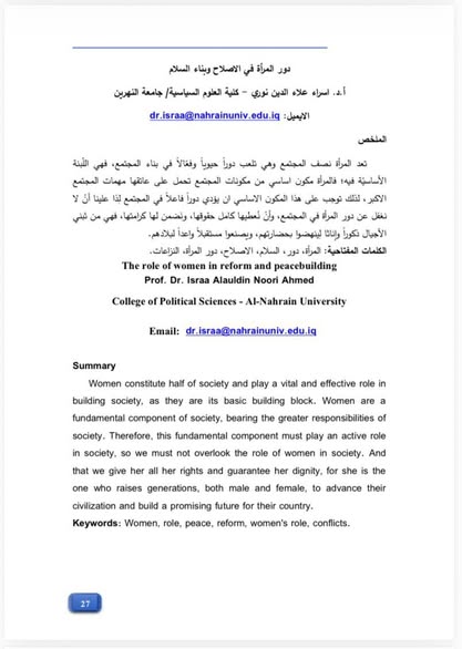 نشرت الاستاذ الدكتورة اسراء علاء الدين نوري التدريسية في قسم النظم السياسية والسياسات العامة بكلية العلوم السياسية جامعة النهرين، بحثاً بعنوان (دور المرأة في الاصلاح وبناء السلام) في العدد العاشر لمجلة دراسات المرأة والتي تصدر عن الامانة العامة لمجلس الوزراء/ الدائرة الوطنية للمرأة العراقية.