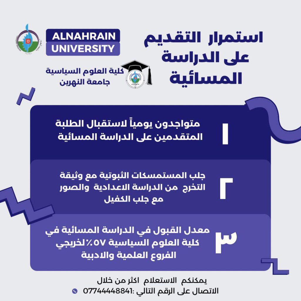دعوة للطلبة الاوائل تدعو كلية العلوم السياسية بجامعة النهرين، الطلبة الثلاثة الاوائل […]