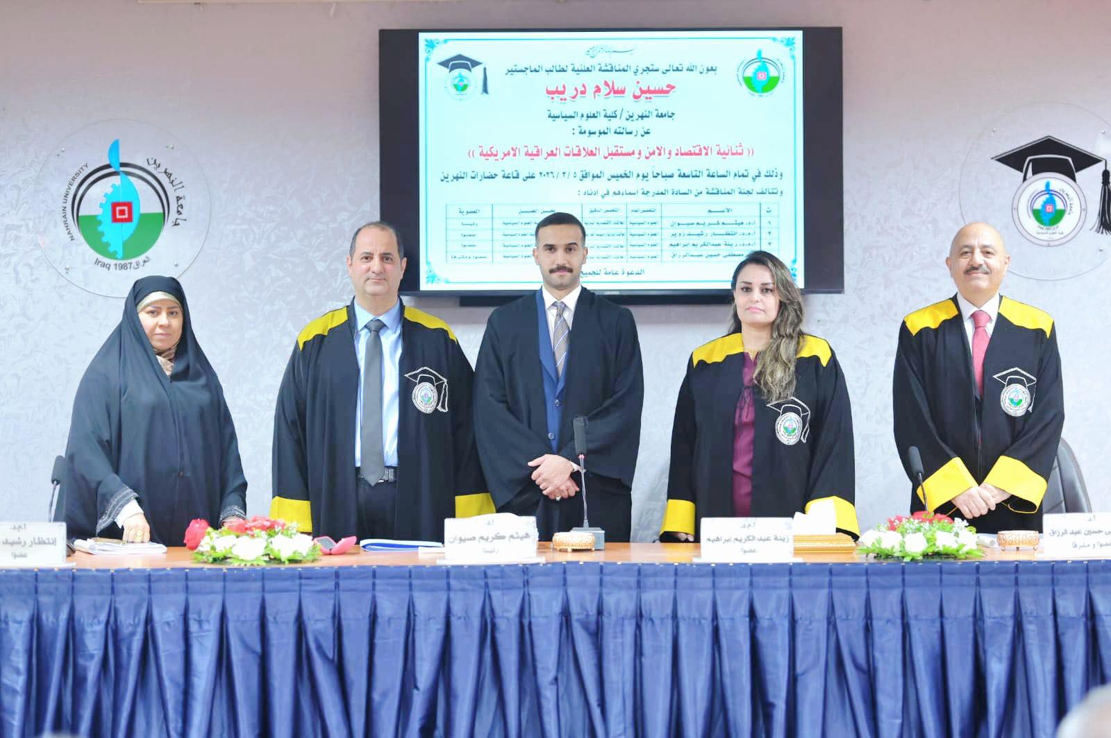 جرت في كلية العلوم السياسية بجامعة النهرين مناقشة رسالة الماجستير الموسومة ( ثنائيةالاقتصاد والامن ومستقبل العلاقات العراقية الامريكية ) للطالب حسين سلام دريب ، من قسم العلاقات الاقتصادية الدولية، وتالفت لجنة المناقشة من الاساتذة: