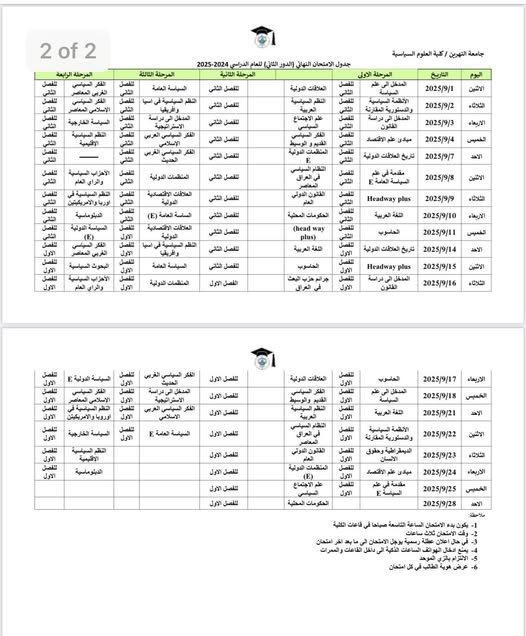 “The College of Political Sciences at Al-Nahrain University announces the exam schedule for the second round for all undergraduate stages, which starts on September 1st and ends on September 28th. Students are required to adhere to the specified dates and follow the announced exam instructions.”